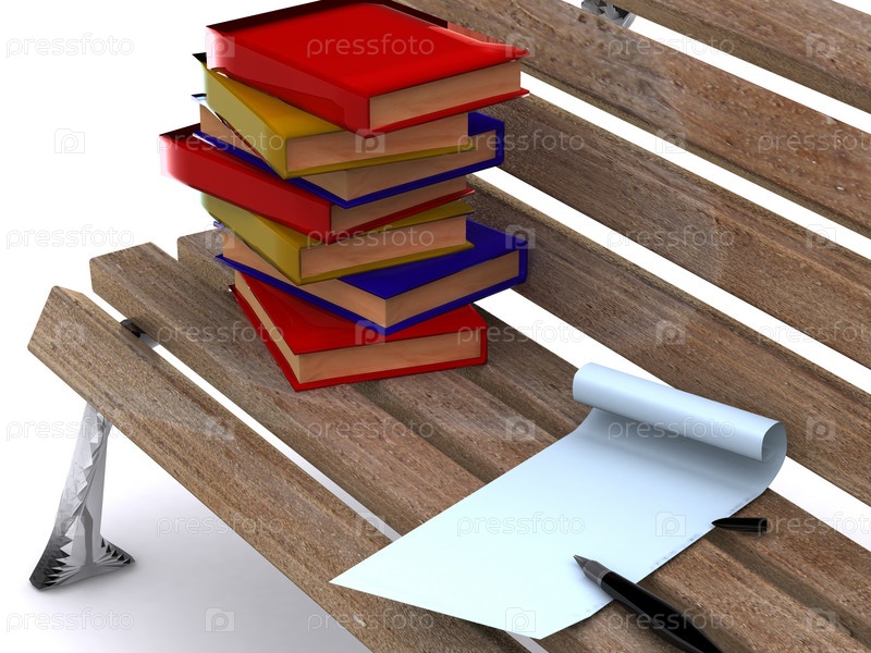 Стопка книг и бумажный свиток на скамейке