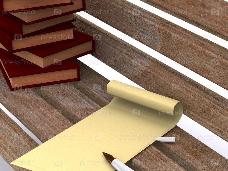 Стопка книг и бумажный свиток на скамейке