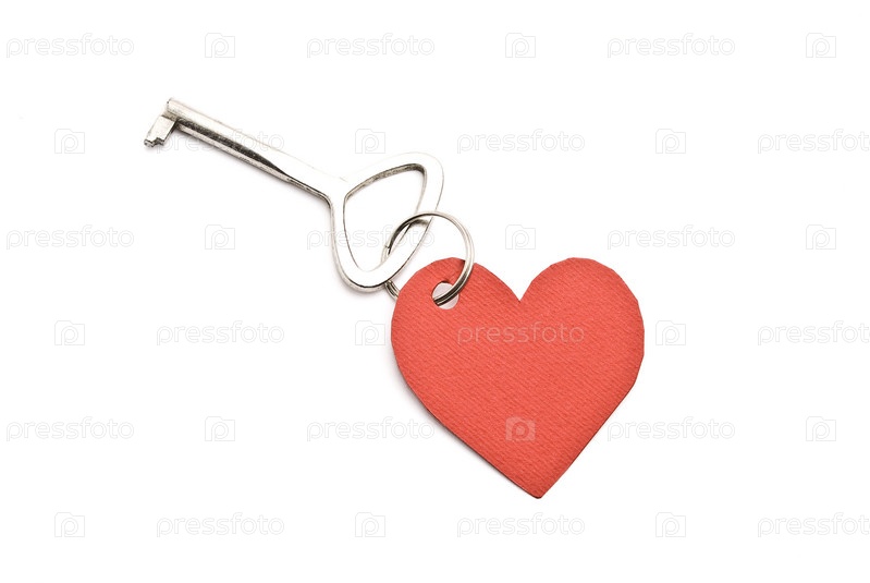 Ключ с красным брелоком в форме сердца, изолированный на белом фоне