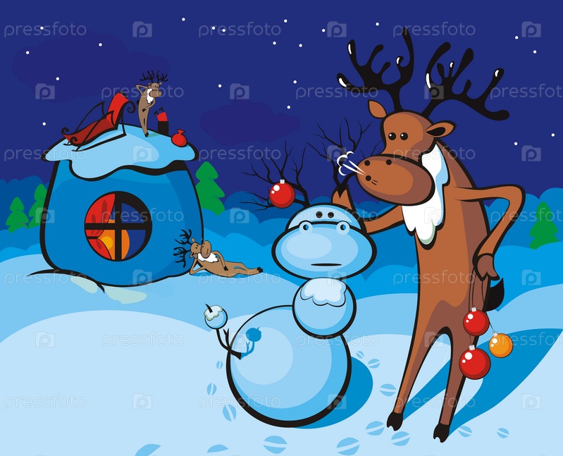 Олень с елочными шарами делает снеговика
