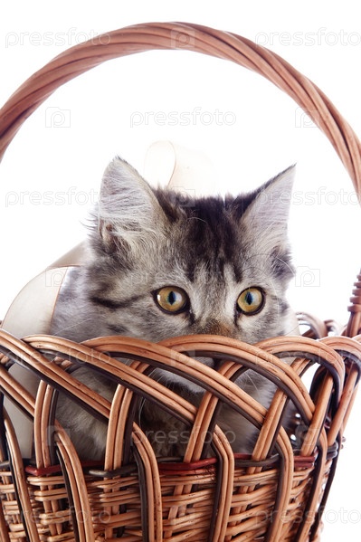 Полосатый кот выглядывает из плетеной корзины