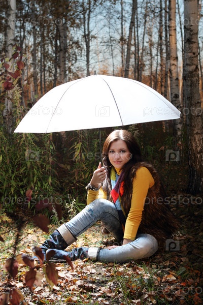 Девушка в лесу под белым зонтиком