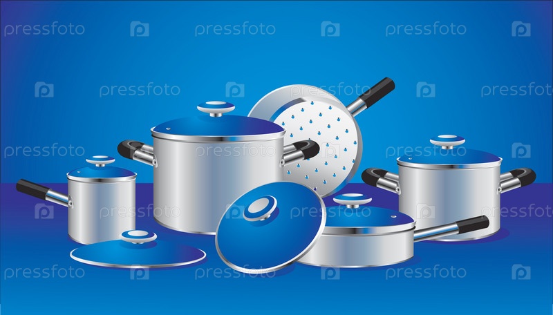 Набор новых кастрюль на синем фоне