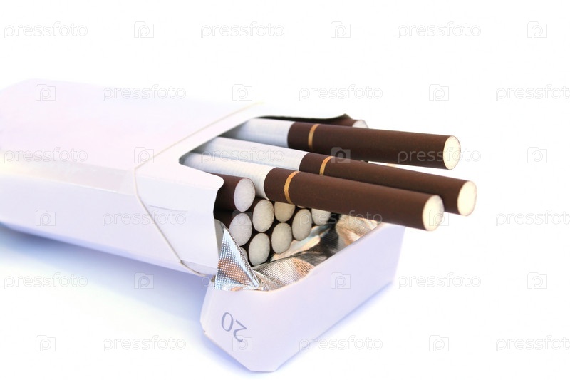 Открытая пачка сигарет на белом фоне