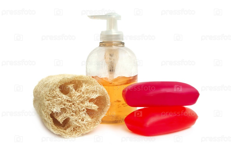 Мыло для личной гигиены и губка loofah с кремом для тела на белом фоне