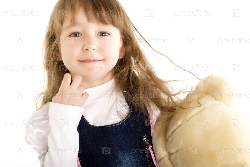 Красивая девочка с плюшевым мишкой на белом фоне