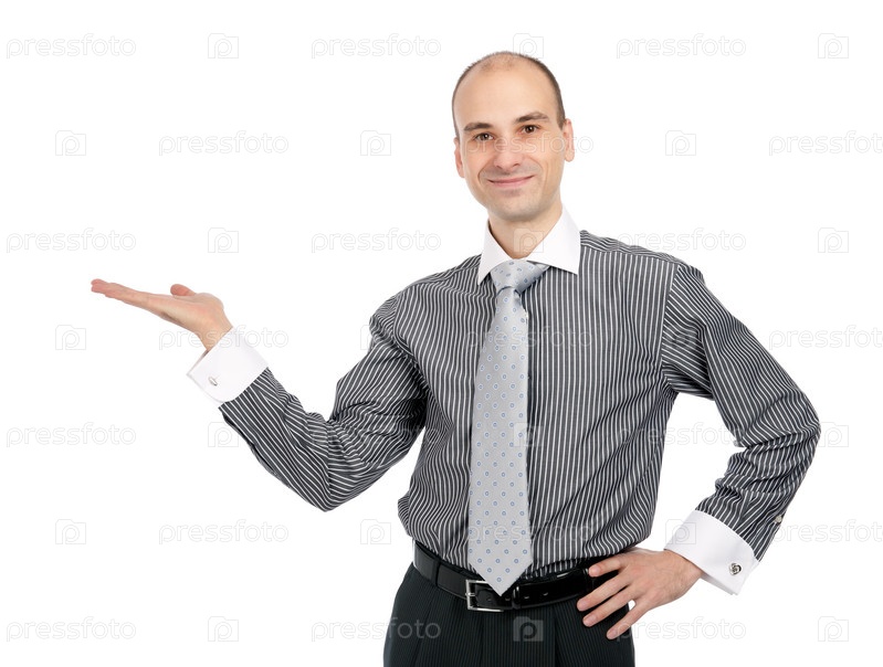 Молодой бизнесмен с поднятой рукой на белом фоне