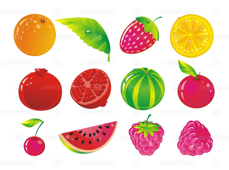 Спелые, сочные ягоды и фрукты на белом фоне