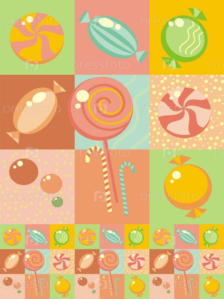 Леденцы и конфеты на разноцветном фоне