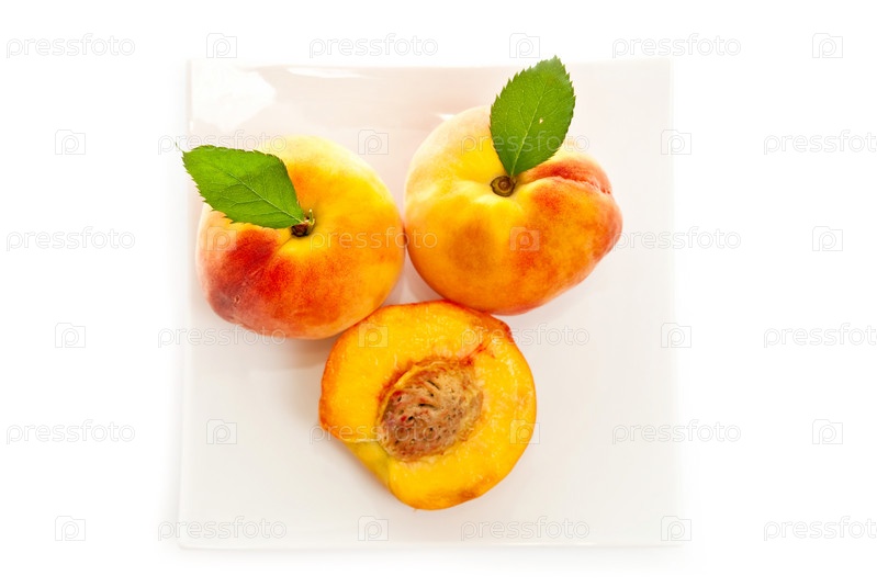 Спелые, сладкие персики на тарелке на белом фоне