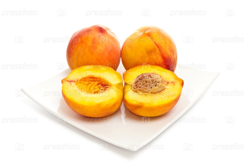 Спелые, сочные персики на тарелке на белом фоне