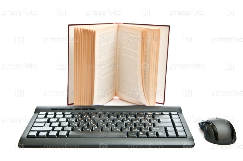 Книга, компьютерная мышь и клавиатура на белом фоне