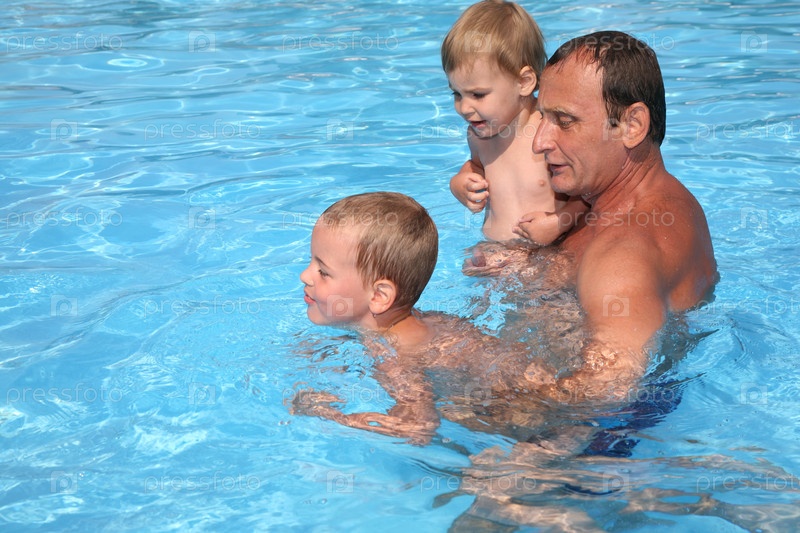 Дедушка с внуками в бассейне