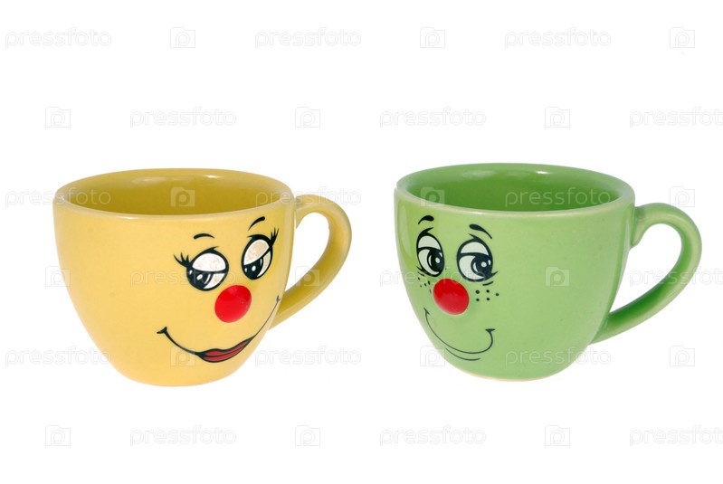 Две кружки с рожицами на белом фоне