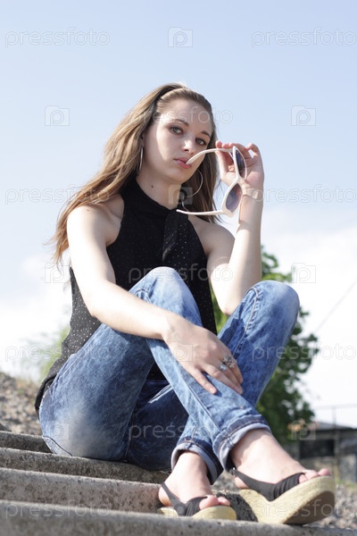 Симпатичная брюнетка сидит на лестнице
