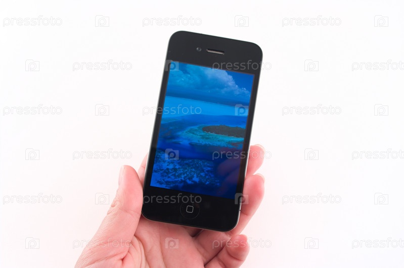 Мобильный телефон в руке на белом фоне