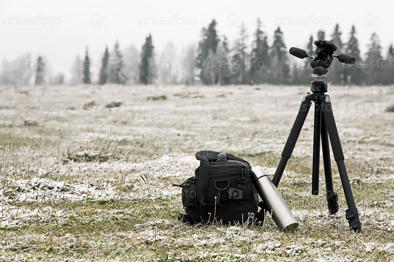 Штатив, сумка и термос на замерзшем поле