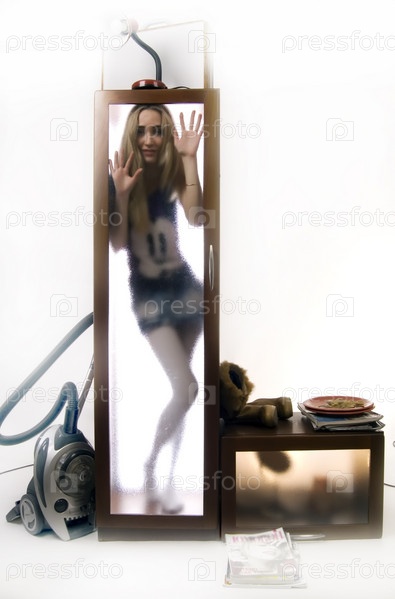 Молодая девушка за стеклянной дверью шкафа