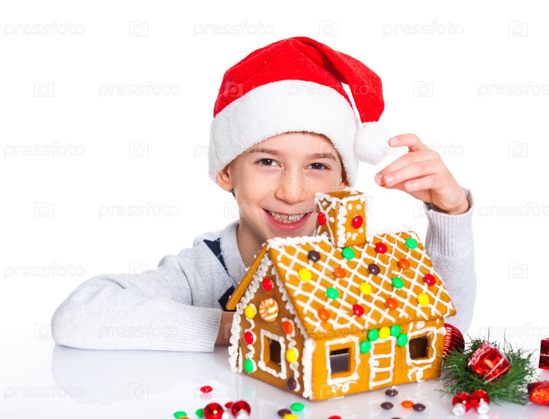Маленький мальчик в шапке Санта-Клауса с имбирным домом
