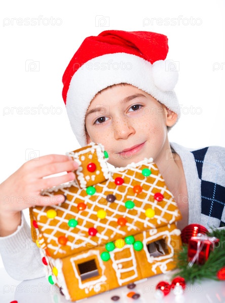 Маленький мальчик в шапке Санта-Клауса с имбирным домом