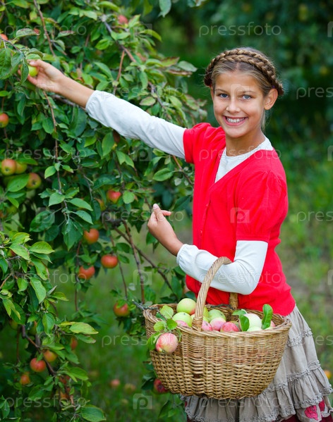 Милая девочка в яблоневом саду