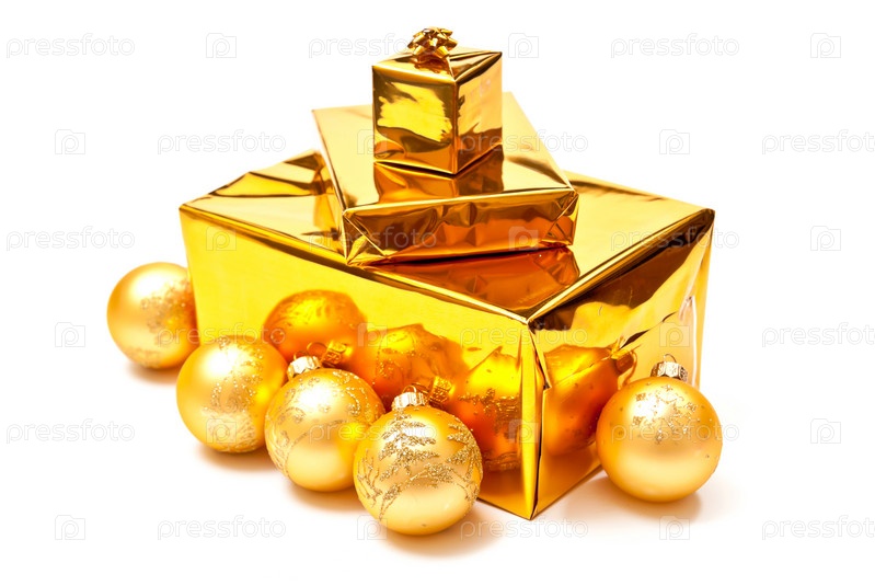 Рождественские коробки и елочные шары на белом фоне