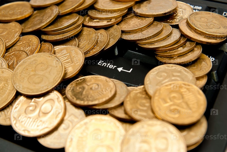 Россыпь монет на компьютерной клавиатуре