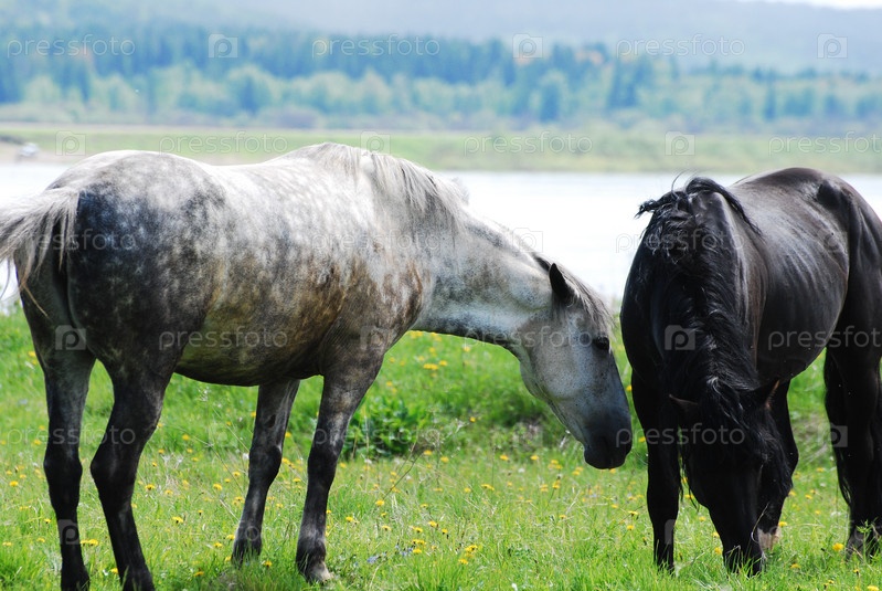 Две лошади, пасущиеся на зеленом лугу возле реки