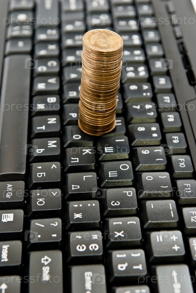 Стопка монет на компьютерной клавиатуре