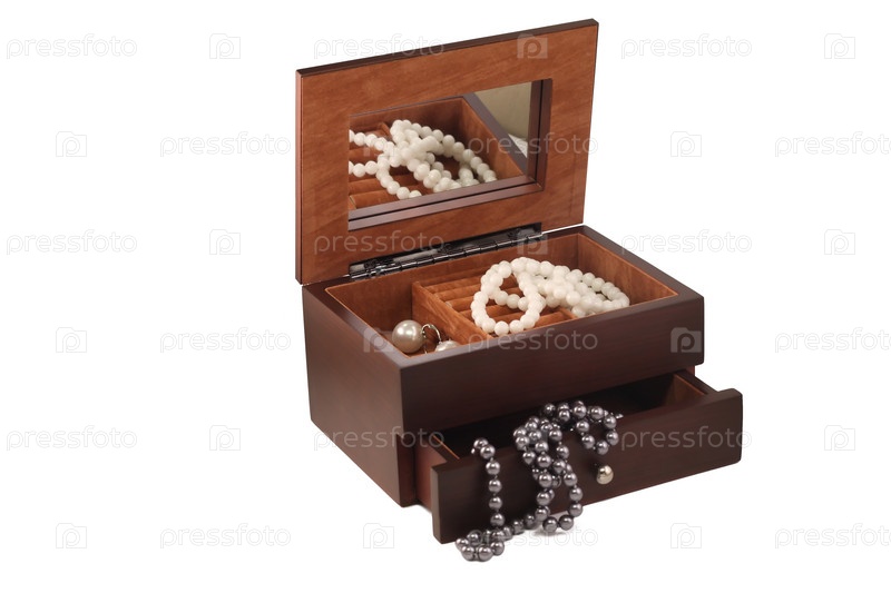 Красивый деревянный гроб со зеркалом и ожерельем с жемчужинами, изолированными на белом фоне