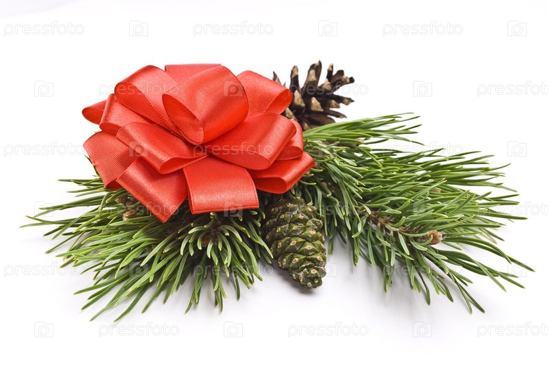 Елочная ветка с шишками и красным бантом на белом фоне
