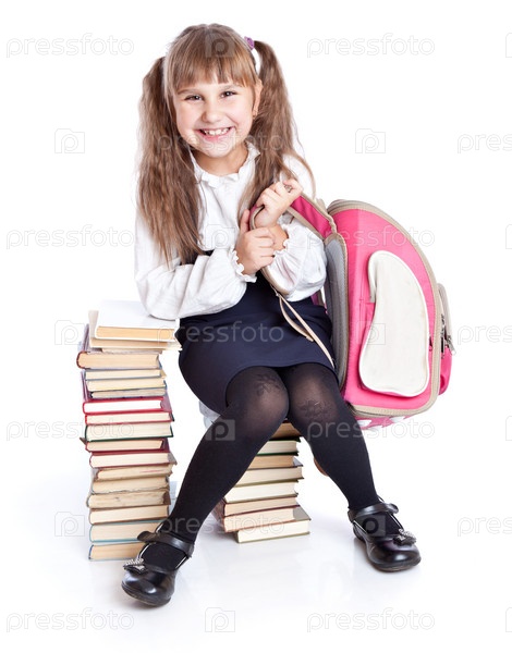 Маленькая девочка сидит на стопке книг, изолированная на белом фоне