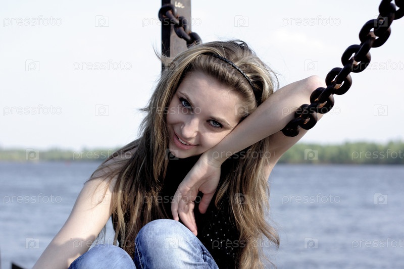 Молодая девушка сидит, опираясь на цепь