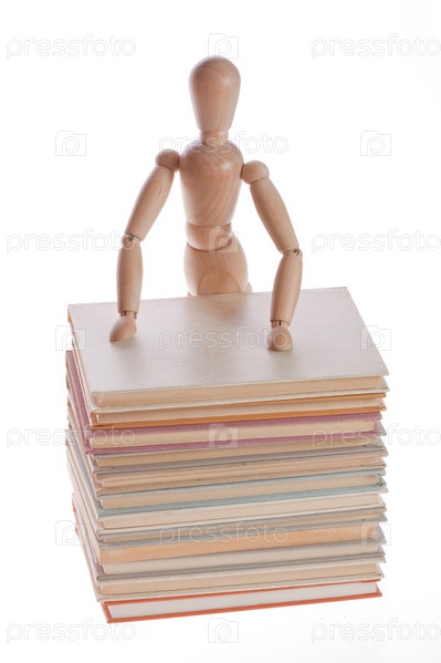 Стопка книг и деревянный человечек на белом фоне