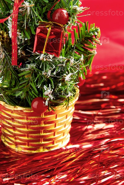 Рождественская елка с украшениями на красном фоне