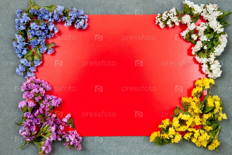 Красная открытка с разноцветными цветами на сером фоне