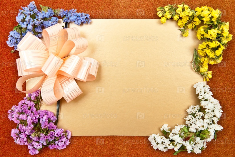 Поздравительная открытка с цветами и бантом на красном фоне