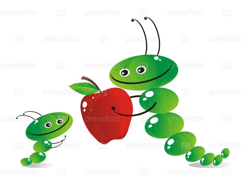 Две гусеницы с яблоком на белом фоне