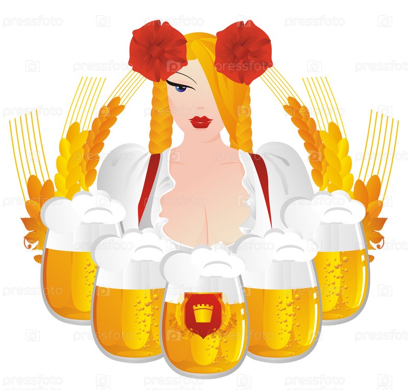 Молодая девушка с кружками пива на белом фоне