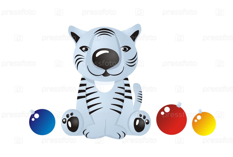 Белый тигренок и елочные украшения на белом фоне