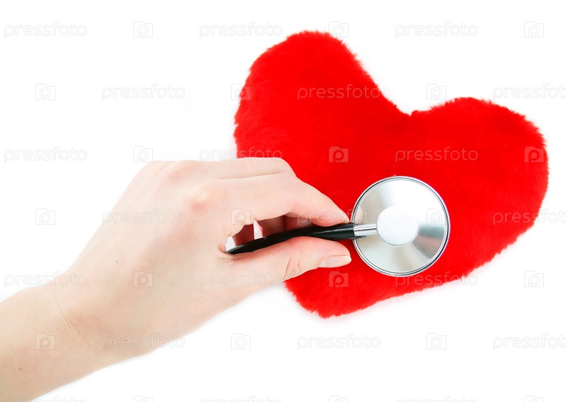 Рука со стетоскопом слушает игрушечное сердце