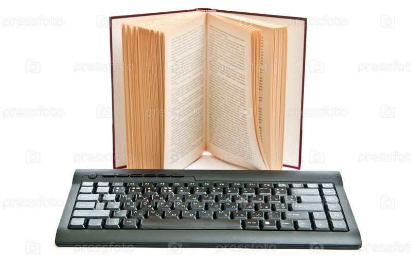 Черная клавиатура и книга на белом фоне