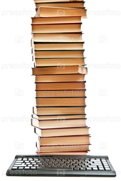 Большая стопка книг и клавиатура на белом фоне