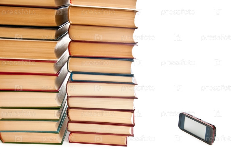 Две стопки книг и мобильный телефон на белом фоне