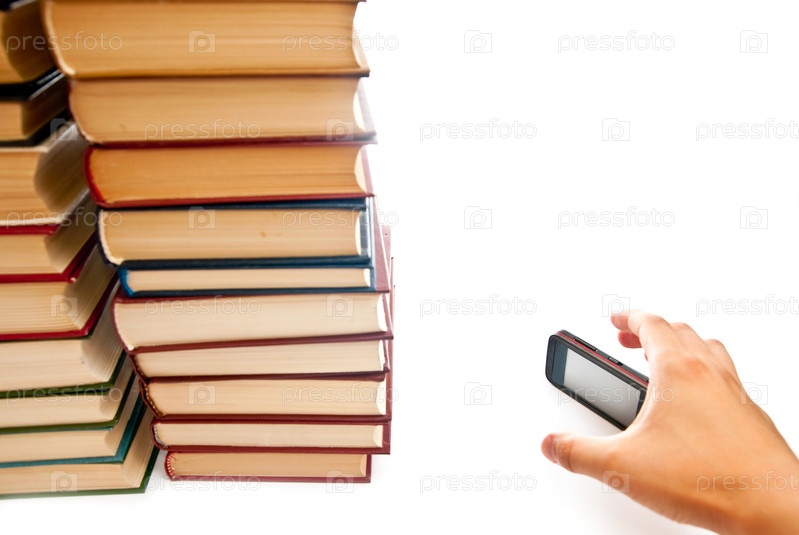 Две стопки книг и мобильный телефон на белом фоне