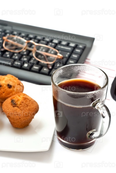 Кружка кофе и кексы на фоне клавиатуры