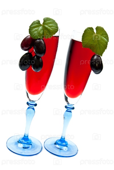 Спелая гроздь винограда и два бокала красного вина