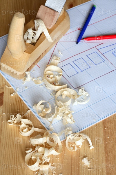 Рубанок со стружкой и чертеж на деревянной поверхности
