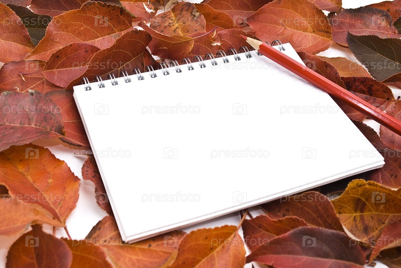 Блокнот и карандаш на фоне осенних листьев