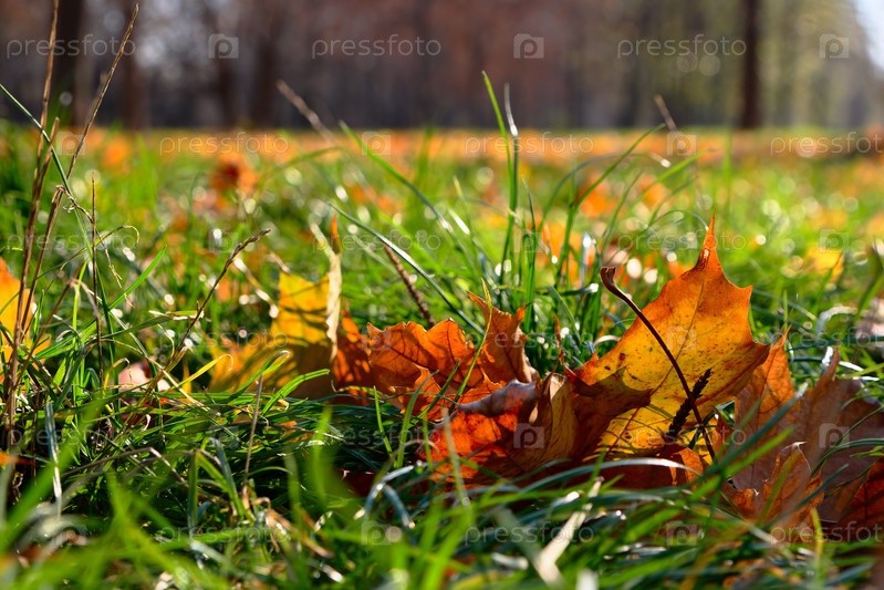 Осенние листья на зеленой траве